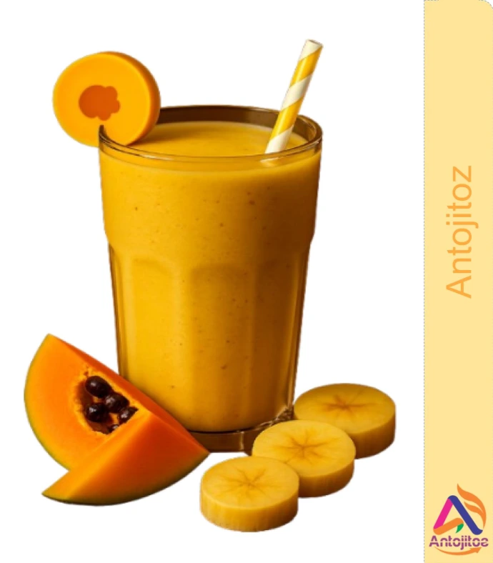 “Papaya alargada y madura junto a banano dulce y aromático, combinados con kéfir cremoso: jugo tropical, energético y digestivo, con sabor suave y naturalmente refrescante.”